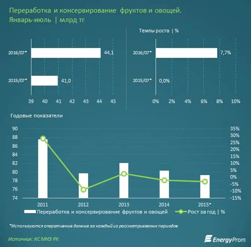 Компании по переработке и консервированию фруктов и овощей выпустили продукции на 44,1 млрд тг за январь-июль 2017, что на 7,7% больше, чем в аналогичном периоде годом ранее. Для сравнения, показатели первых 7 месяцев 2015 обгоняли объемы 2014 всего на 0,03%.