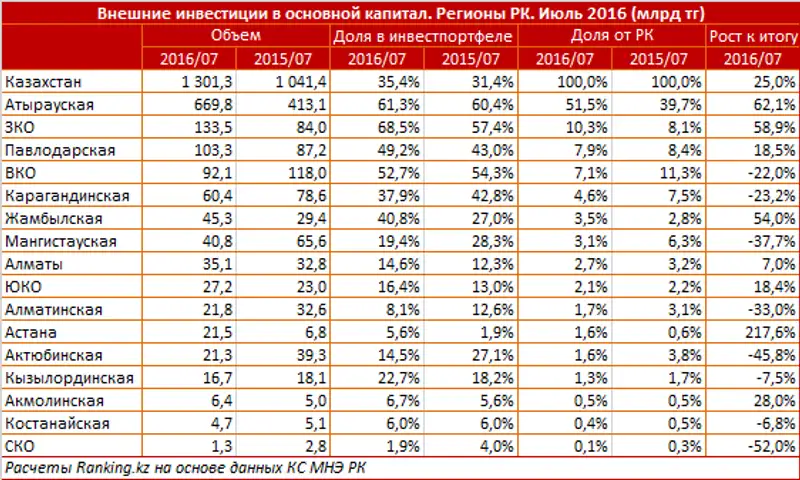 Ключевой сферой для инвестирования иностранцы избирают нефтедобывающую промышленность, что следует из региональной структуры инвестиций внешнего сектора. Свыше 50% всех инвестиций в РК за 7 месяцев 2016 иностранцы осуществили в Атырауской области. При этом Атырауская область одна из четырех областей, в которой доля иностранных вложений превышает 50% (и составляет 61,3%). Большее значение показала только Западно-Казахстанская область, граничащая с Россией - 68,5%.