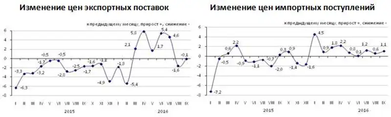 Изменение цен экспортных поставок и импортных поступлений в январе-сентябре 2016 года