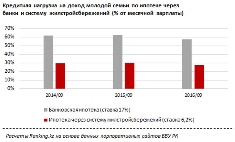 На кредит для покупки той же самой квартиры через систему жилстройсбережений молодая семья с ребенком будет тратить не более 28% своего месячного дохода, или 39 тысяч тенге.