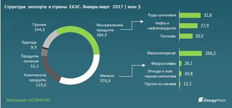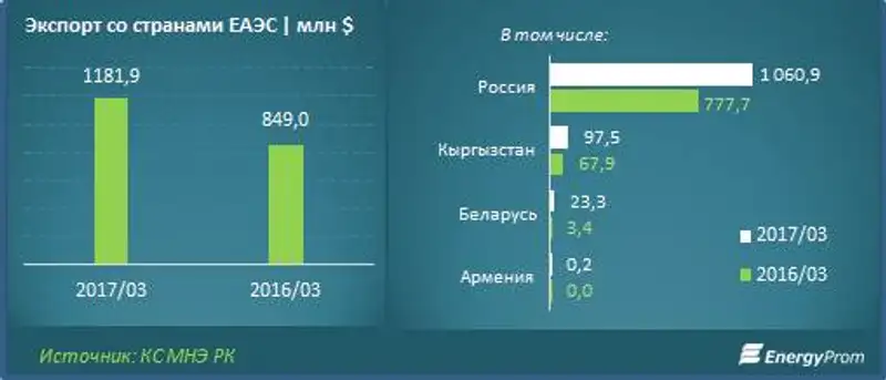 За первый квартал 2017 года экспорт РК увеличился на 30% к аналогичному периоду прошлого года, составив $10,8 млрд. В том числе экспорт в страны ЕАЭС увеличился на 39,2% и составил $1,2 млрд. Из которых $1 млрд пришлось на Россию, рост экспорта в РФ за первый квартал текущего года составил 36%.