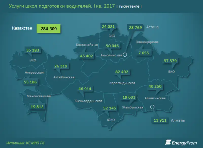 Наибольший объем услуг в секторе зафиксирован в Восточно-Казахстанской области - 97,4 млн тг, -16,1% за год. Наибольший рост отмечен в Карагандинской области, занимающей второе место по объему услуг - сразу +55% за год, до 82,5 млн тг.