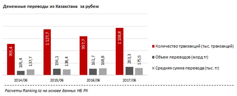 За 6 месяцев текущего года из Казахстана за рубеж через различные системы денежных переводов было оправлено 203,3 млрд тенге, или на 25,8% больше объема за январь-июнь прошлого года. Общее количество переводов достигло 1,2 млн транзакций - что на 21% выше уровня годом ранее.