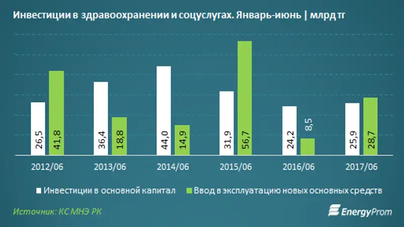 Темпы роста инвестиций в здравоохранение остаются слабыми. За январь-июнь текущего года в основные фонды предприятий здравоохранения и социальных услуг было инвестировано 25,9 млрд тенге, или на 6,8% больше объемов прошлого года.