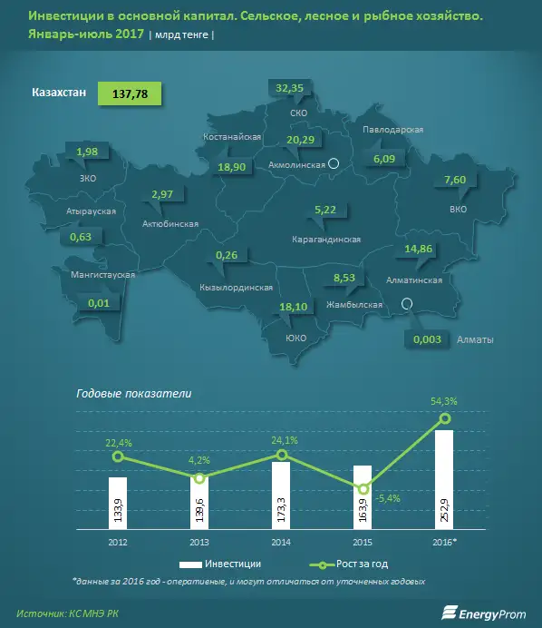 По итогам 7 месяцев объем инвестиций в основной капитал сельского, лесного и рыбного хозяйства составил 137,78 млрд тг - на 21,4% больше, чем в аналогичном периоде годом ранее.