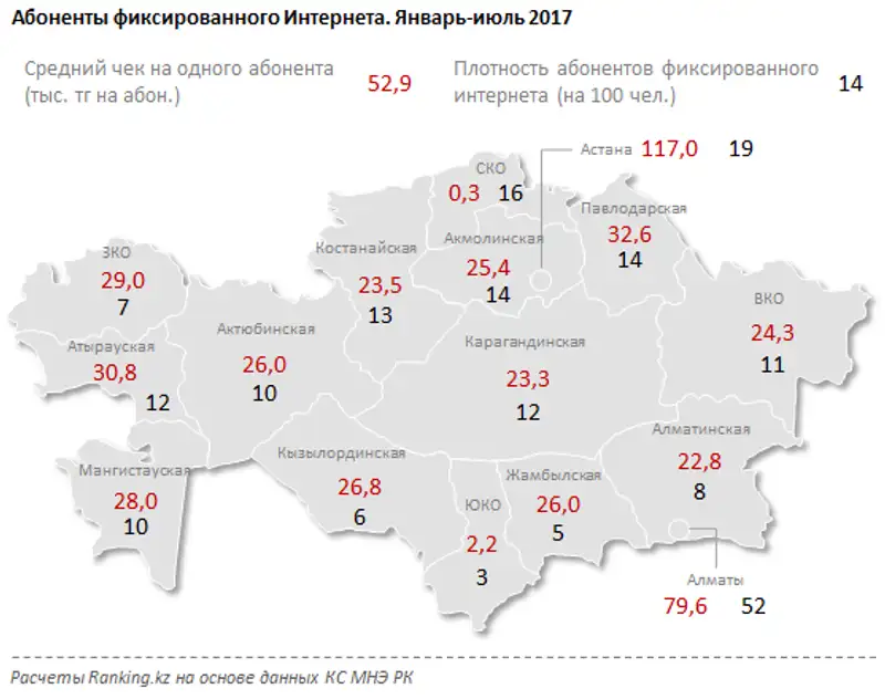 Каждый интернет-абонент принес провайдерам за 7 месяцев в среднем по 52,9 тысячи тенге - это немного меньше, чем в аналогичном периоде годом ранее (-1,4%). Самые высокие средние чеки - в Астане (117 тыс. тг с абонента) и Алматы (79,6 тыс. тг с абонента).