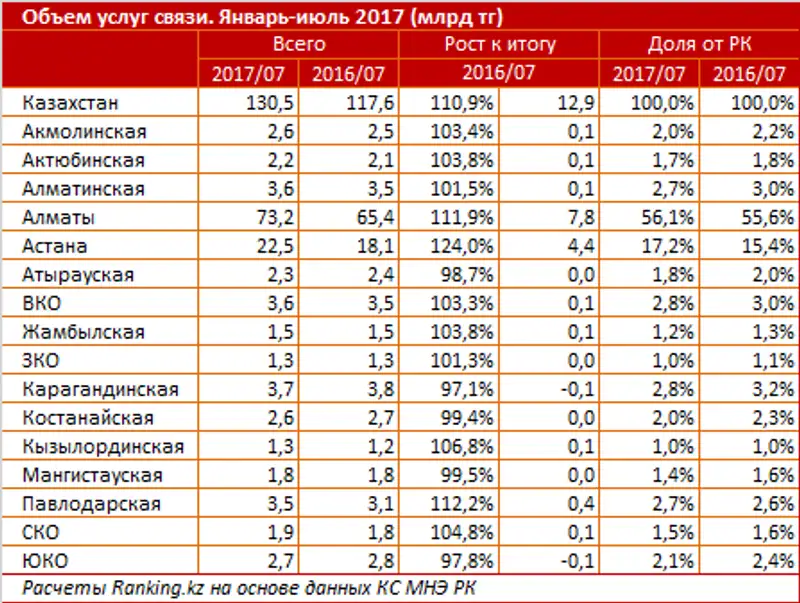 Наибольшие темпы роста отмечены в столице - здесь объем услуг вырос сразу на 24% за год, до 22,5 млрд тг. На втором месте - Павлодарская область: +12,2% за год, до 3,5 млрд тг, далее - финансовый центр: здесь услуги провайдеров выросли на 11,9%, до 73,2 млрд тг.