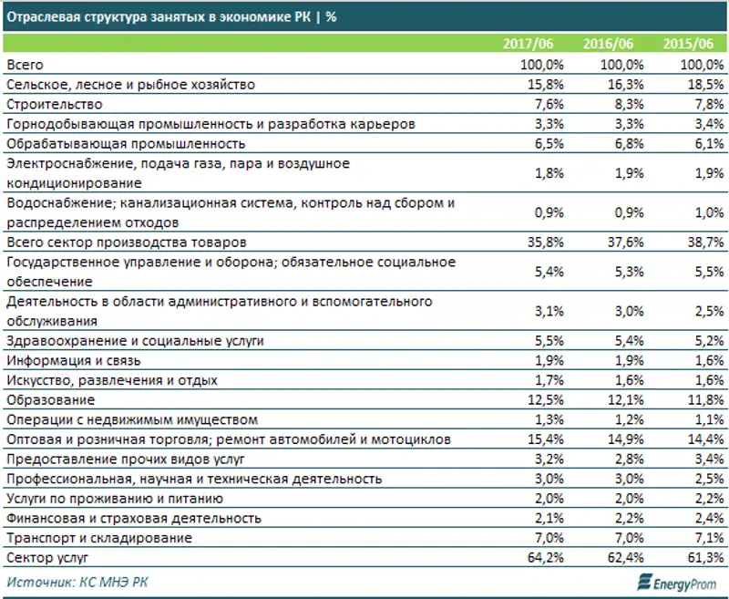 Отраслевая структура привлеченных инвестиций показывает, что интерес к сервисной экономике падает. Удельный вес услуг в портфеле за два года сократился на 3% до 39,4. Между тем это самый емкий сектор с точки зрения генерации рабочих мест. По итогам первого полугодия 2017 года в сервисном сегменте экономики работает почти 5,5 миллионов человек - это 64,2% от всего занятого населения Казахстана.