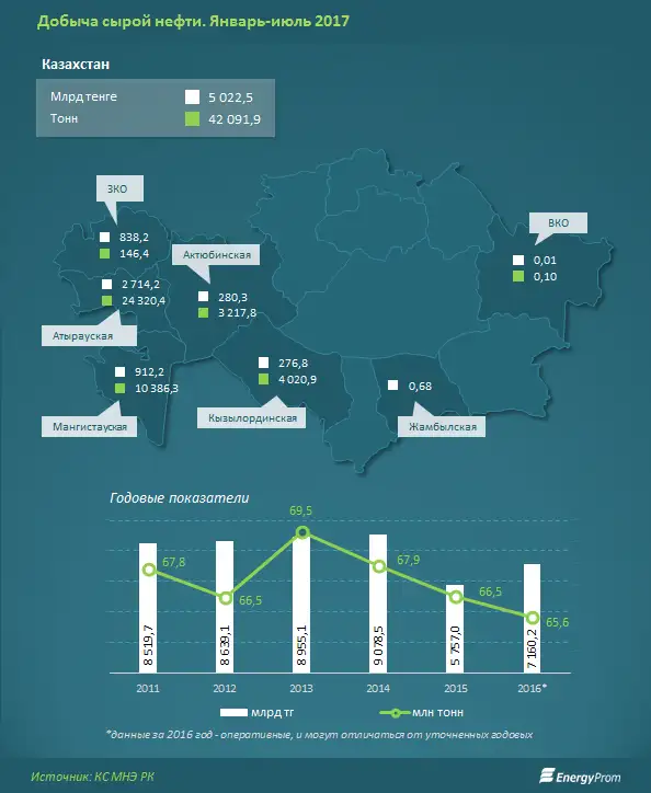 Более половины всей нефтедобычи пришлось на Атырауский регион. Здесь работают гиганты Тенгизшевройл, РД КазМунайГаз и North Caspian Operating Company.