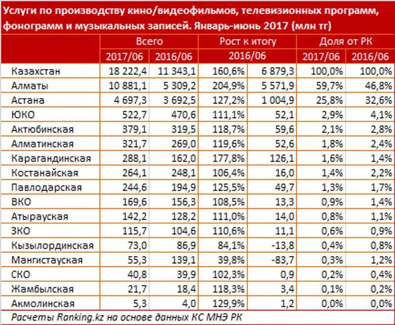 Самые высокие темпы роста показали звуко-видео-студии и киноклубы Алматы - сразу более чем в 2 раза, до 10,9 млрд тг. Это уже 59,7% от РК, против 46,8% в аналогичном периоде 2016.