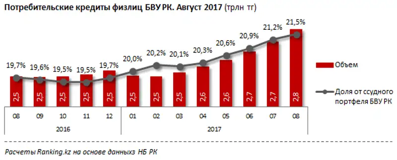 Объем потребительских кредитов второй месяц подряд бьет рекорды - на конец августа 2017 года портфель потребительских кредитов БВУ РК составил 2,8 трлн тг, увеличившись за месяц на 3,0% (80,2 млрд), рост за год составил 12,1% (302,2 млрд).
