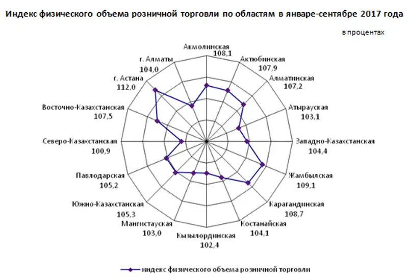 Наибольший удельный вес в общем объеме розничной торговли республики в январе-сентябре 2017 года приходится на г. Алматы (28,1%), г. Астану (12%), Восточно-Казахстанскую (9,4%) и Карагандинскую (9,1%) области.