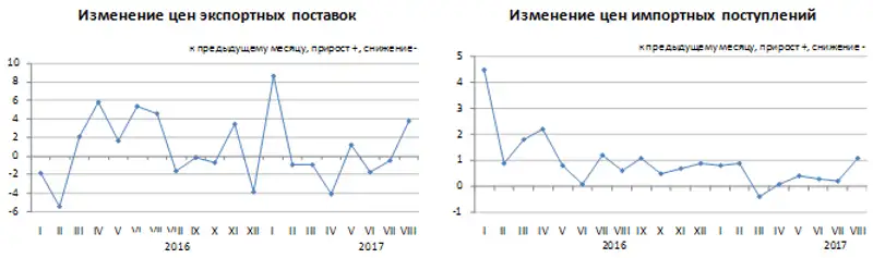 Изменение цен экспортных поставок и импортных поступлений в январе-августе 2017 года