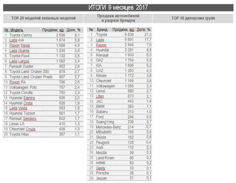 Рейтинг наиболее востребованных казахстанцами брендов по итогам отчетного периода возглавляет Toyota: за январь-сентябрь 2017 г. на территории республики продано 6 839 автомобилей японской марки. Сбыт моделей Lada составил 5 691 единиц. Третью позицию занял Ravon с показателем 2 846 реализованных автомобилей.