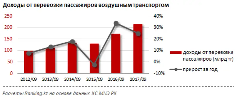 Следует отметить, что в прошлом году на фоне резкого ослабления национальной валюты тарифы на авиаперелеты также существенно выросли, и под влиянием этого факта казахстанцы ограничили себя в поездках воздушным путем. Стоимость перелета за январь-сентябрь 2016 года подорожала на 11,8%. При этом снижение уровня пассажирооборота в прошлом году не сказалось на доходах - напротив, выручка от перевозок пассажиров увеличилась на 33,9% и составила 173,3 миллиарда тенге.