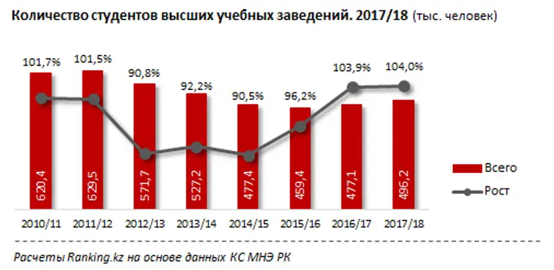 На 2017/18 учебный год число студентов в вузах достигло 496,2 тыс. человек, рост по сравнению с прошлым учебным годом на 4%.