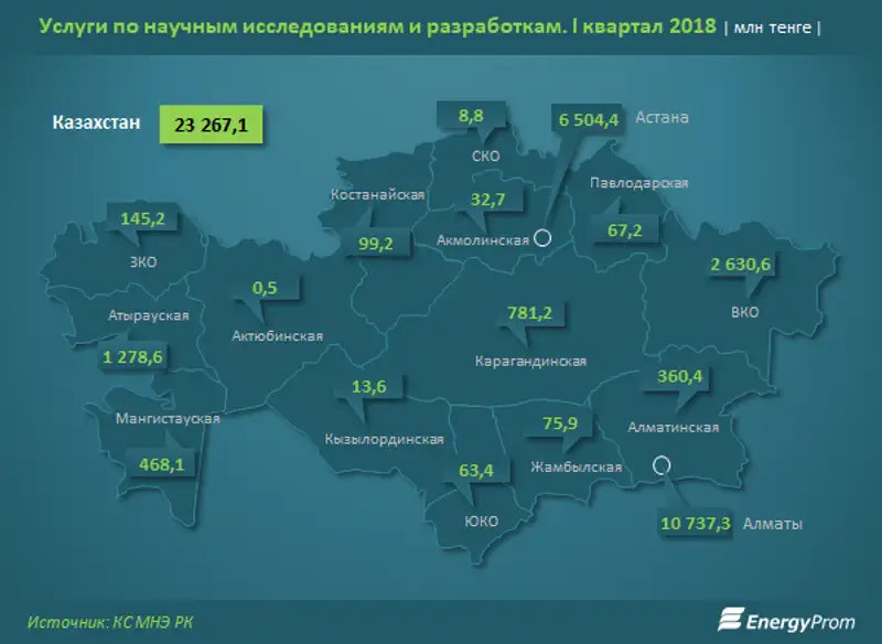 Основные научные центры страны - столицы: здесь сконцентрировано три четверти всех услуг НИОКР по РК, 10,7 млрд тг, почти вдвое больше, чем годом ранее - в Алматы, и 6,5 млрд тг, на четверть больше, чем год назад - в Астане.