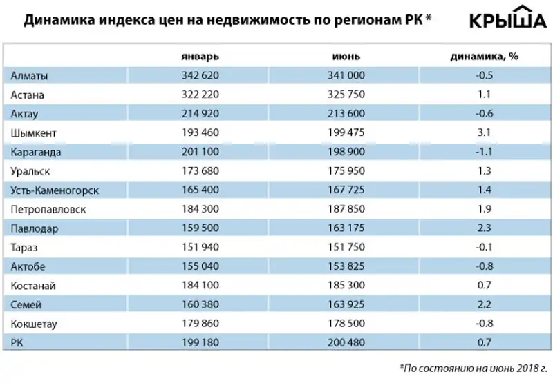 Положительная динамика в пределах 1-4 % наблюдается (относительно июня 2017 года) в Караганде (+1.2 %), Павлодаре (+1.2 %), Актобе (+1.3 %), Уральске (+2 % ), Астане (+2.9 %) и Костанае (+3.9 %). В Алматы и Шымкенте зафиксирован прирост, но менее значительный: 0.7 и 0.3 % соответственно.