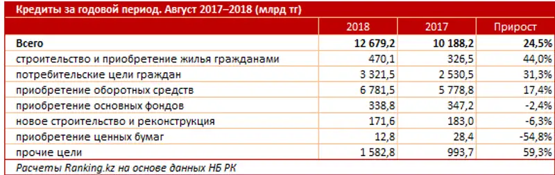 Как отмечается в исследовании ranking.kz, даже с учётом заметного увеличения кредитной активности банков второго уровня в целом, некоторые сегменты выделились опережающими темпами роста. Так, объёмы выданных с августа 2017 по август 2018 года ипотечных кредитов, то есть ссуд на строительство и приобретение жилья гражданами, выросли год-к-году сразу на рекордные 44%, до 470,1 млрд тг.