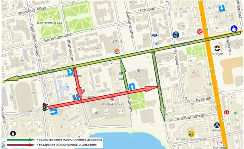 Так, одностороннее движение планируется ввести на участках по ул. Бухарбай батыра от пр. Женис до ул. Азербайжана Мамбетова и по ул. Желтоксан от ул. Кенесары до ул. Бухарбай батыра. Изменения вступят в силу в четверг, 15 ноября 2018 г.