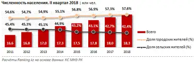 По итогам I полугодия в РК в городах проживает 10,5 млн человек — на 4% больше, чем годом ранее. Это уже 57,6% от всего населения РК против 57,3% год назад и всего 54,6% — в 2011 году, до принятия прогнозной схемы.