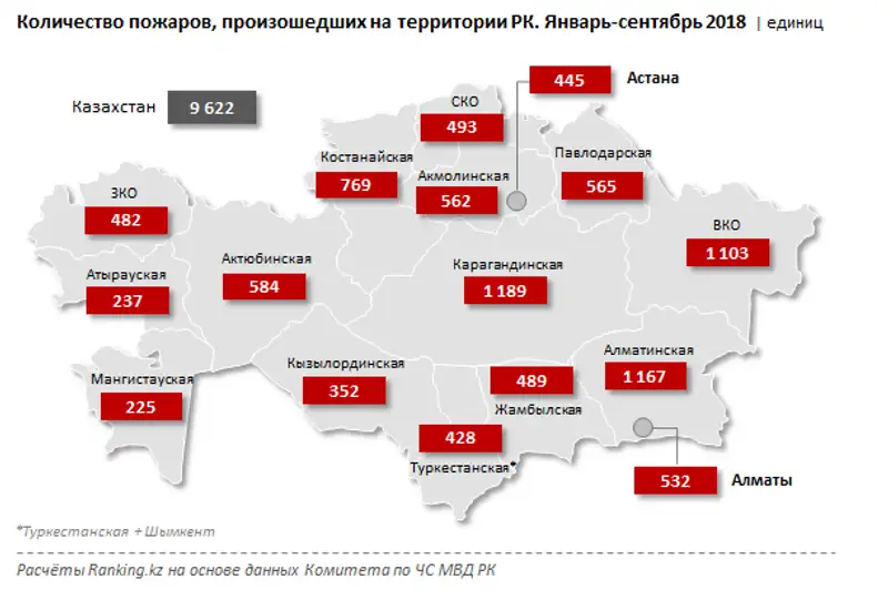 Рост количества пожаров наблюдался в Южной столице (сразу на 12% год-к-году), ВКО (+11%), Актюбинской области (+9%), а также Мангистауской и Павлодарской областях (+ 6-7%) и ЗКО (+2,6%).