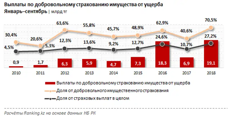 Стоит отметить, что за тот же период — три квартала 2018-го — страховые выплаты в сфере страхования недвижимости и прочего имущества от ущерба показали весьма значительный годовой рост: сразу почти втрое, до 19,1 млрд тг. Это уже 70,5% от всех выплат страховых компаний казахстанцам в сфере добровольного имущественного страхования, против 40,6% годом ранее, и 27,2% — от совокупных страховых выплат по стране, против 10,7% год назад.