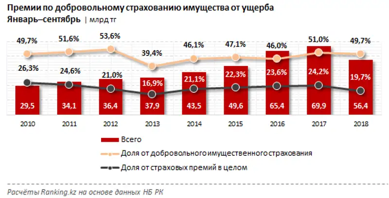 Доля страхования недвижимости и прочего имущества от ущерба в добровольном имущественном страховании уменьшилась за год с 51% до 49,7%, а в общем объёме страховых премий — с 24,2% до 19,7%.