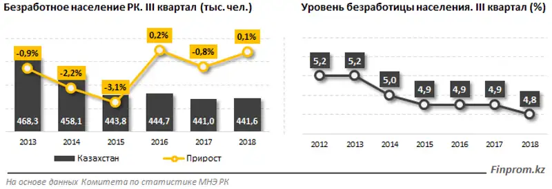 К концу III квартала 2018 года количество безработного населения достигло 441,6 тыс. человек, наблюдается несущественный рост — на 0,1% год-к-году. При этом уровень безработицы за текущий год составил 4,8%, это минимальное значение показателя за последние пять лет.