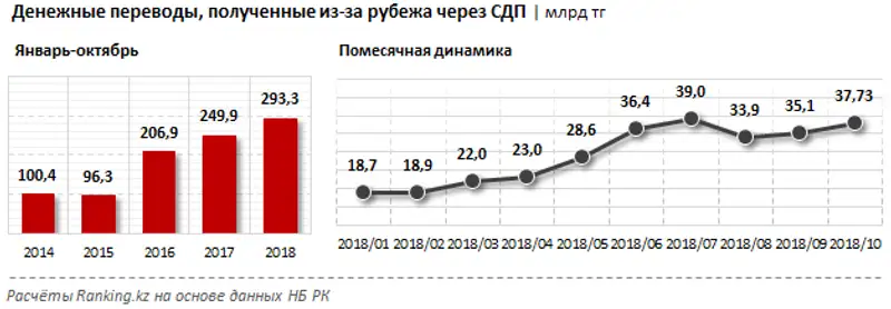 Объём денежных переводов, отправленных через СДП из-за рубежа в РК, за январь-октябрь 2018 года достиг 293,3 млрд тг, что на 17,4% больше, чем за аналогичный период прошлого года.