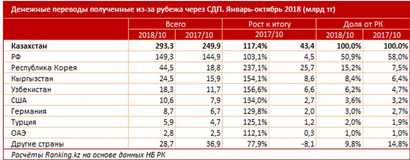 На втором месте по объёму отправленных в РК переводов Южная Корея: 44,5 млрд тг, что в 2,4 раза больше, чем за январь-октябрь 2017 года. Доля страны выросла с 7,5% до 15,2%.