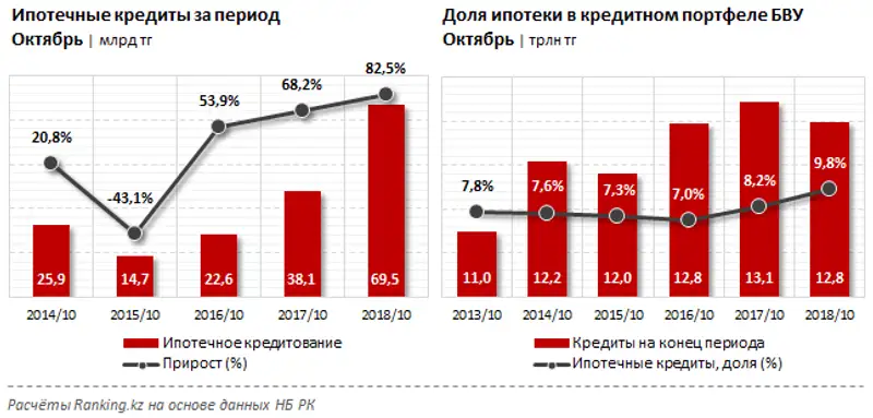 Ипотечное кредитование увеличилось на 82,5% за год: за октябрь текущего года объём банковских займов в секторе достиг 69,5 млрд тг, против всего 38,1 млрд тг в аналогичном периоде годом ранее. Драйвером бурного роста ипотечных займов стала программа «7-20-25», стартовавшая 5 месяцев назад. За этот период было выдано займов на сумму 42,4 млрд тенге.