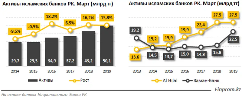 На конец марта 2019 года исламские банки в совокупности нарастили активы на 15,8% за год, сумма составила 50,1 млрд тг. Годом ранее сумма активов составляла 43,2 млрд тг, прирост был равен 16,2%.