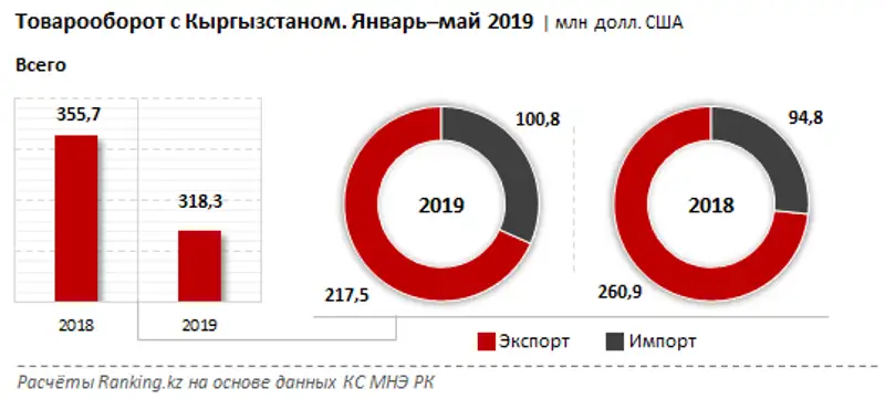 К лету с начала года товарооборот Республики Казахстан с Кыргызстаном составил 318,3 млн долл. США — на 10,5% меньше, чем годом ранее. Примечательно, что сократился экспорт в Кыргызстан — на 16,6%, до 217,5 млн долл. США. Импорт в РК из КР, напротив, вырос на 6,3% за год и составил 100,8 млн долл. США.