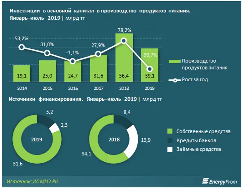 Основными инвесторами в производство продуктов питания остаются собственники бизнеса: их средства сократились на 2,4 млрд тг, или 7,1%, и составили 31,6 млрд тг.