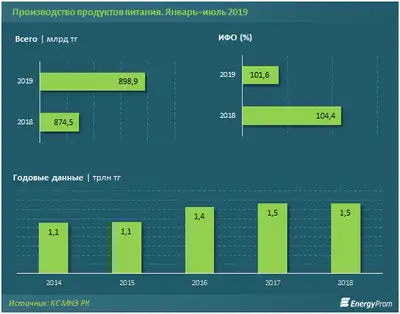 За семь месяцев текущего года объём производства продуктов питания в стоимостном выражении достиг 898,9 млрд тг, реальный рост (с учётом инфляции) составил 1,6% за год. Для сравнения: за аналогичный период прошлого года показатель составил 874,5 млрд тг, при реальном росте на 4,4%. Доля производства продуктов питания в обрабатывающей промышленности составила 14,7% (годом ранее — 15%).