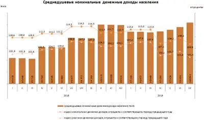 Среднедушевые номинальные денежные доходы населения по оценке в июле 2019г. составили 100982 тенге, что на 6,9% выше, чем в июле 2018г., реальные денежные доходы за указанный период увеличились на 1,4%.