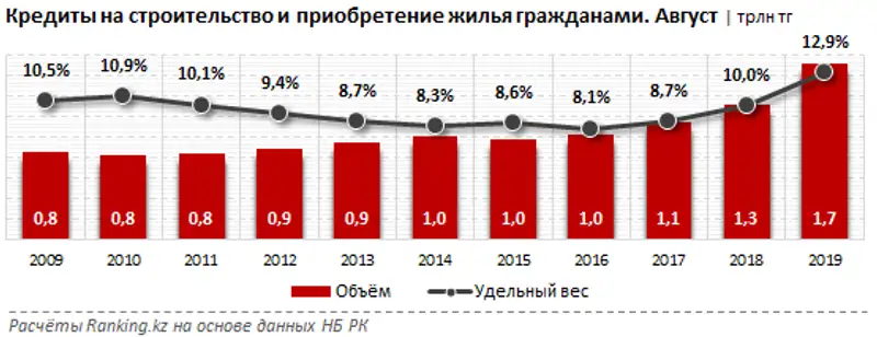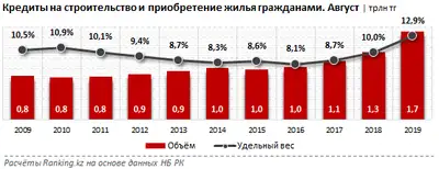 Объём кредитов на строительство и приобретение жилья растёт четвёртый год подряд, причём за последний год был отмечен рост сразу на 30,9% к концу августа 2019 года, до 1,7 трлн тг.