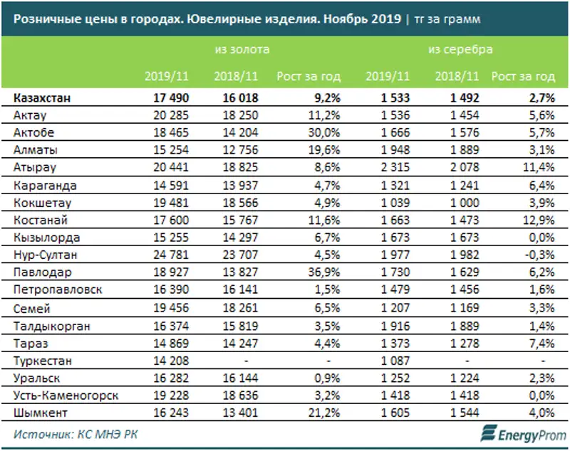 Серебряные ювелирные изделия подорожали на 2,7% за год, до 1,5 тыс. тг по итогам ноября 2019-го. Дороже всего они стоили в Атырау (2,3 тыс. тг, плюс 11,4% за год), Нур-Султане (2 тыс. тг, минус 0,3% за год) и Алматы (1,9 тыс. тг, плюс 3,1% за год).