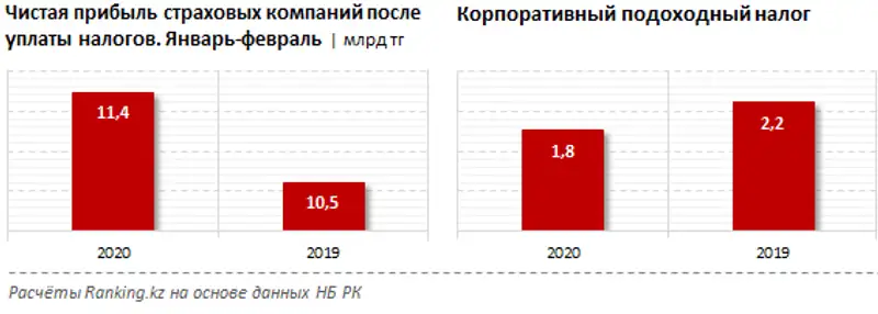 Корпоративный подоходный налог страховых компаний за январь-февраль 2020 года составлял 1,8 млрд тг — на 21,6% меньше, чем за аналогичный период прошлого года. Таким образом, чистая прибыль страховых компаний после уплаты налогов составила 11,4 млрд тг — на 8,5% больше, чем за январь-февраль 2019 года.