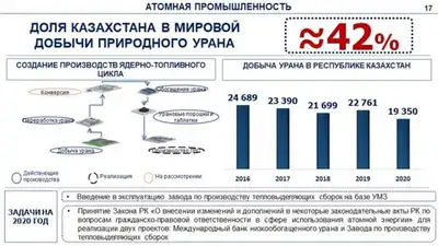 На данный момент, по данным министерства, доля Казахстана в мировой добычи природного урана 42%. Есть 25 контрактов по урану. В этом планируется добыть 19350 тонн урана.