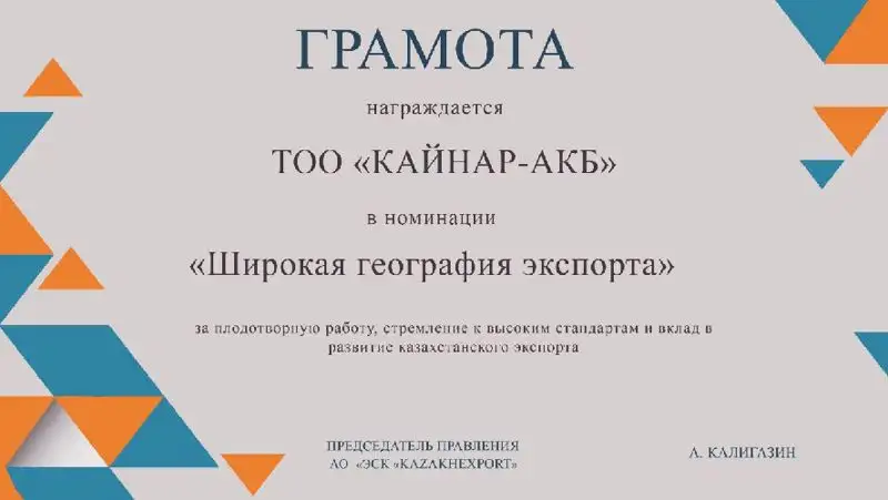 Грамота в номинации «Широкая география экспорта» вручена ТОО «Кайнар-АКБ» за плодотворную работу, стремление к высоким стандартам и вклад в развитие казахстанского экспорта. В рамках страховой поддержки KazakhExport продукция компании экспортируется в Италию, Россию, Грузию, Армению, Таджикистан, Азербайджан, Туркменистан и многие другие страны.