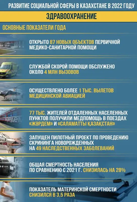 Вместе с тем были внедрены профилактические осмотры для сельских жителей, запущен пилотный проект по проведению скрининга новорожденных на 49 наследственных заболеваний, расширены пакеты профосмотров детского населения и возобновлена работа медпоездов "Жәрдем" и "Саламатты Қазақстан", которые посетили 147 станций и оказали медицинскую помощь более 77 тыс. жителей отдаленных населенных пунктов.