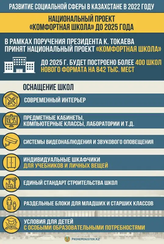 В этом году по поручению президента принят национальный проект "Комфортная школа". В его рамках до 2025 года планируется построить более 400 школ абсолютно нового формата на 842 тыс. мест, которые будут полностью оснащены необходимым учебным оборудованием, предметными кабинетами, компьютерными классами, лабораториями и мастерскими, системами видеонаблюдения и звукового оповещения, индивидуальными шкафчиками для детей и т.д.