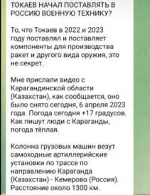В социальных сетях и мессенджерах распространяется видео, снятое 6 апреля 2023 года в Карагандинской области, на котором перевозят военную технику. Подпись информирует, что таким образом ее поставляют в Россию.