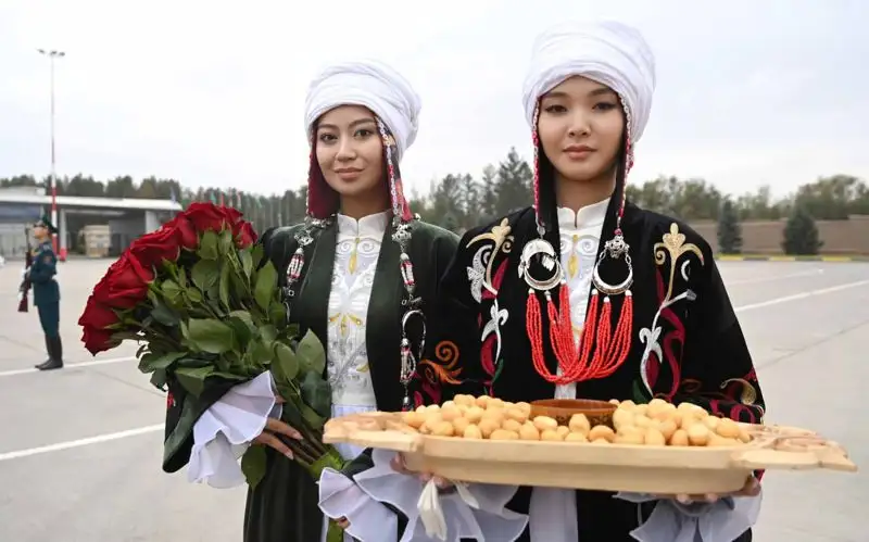 Красавицы в национальных костюмах угостили гостей баурсаками и медом.