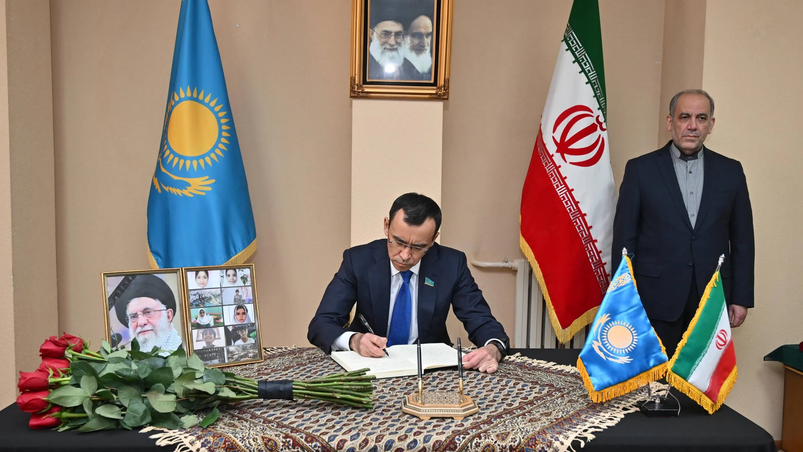 "От имени президента Республики Казахстан Маулен Ашимбаев выразил глубокие соболезнования народу Ирана, а также родным и близким погибших в результате трагических событий. В ходе встречи с чрезвычайным и полномочным послом Ирана Али Акбаром Джоукаром было отмечено, что Казахстан с особой горечью воспринял известие о трагедии, в результате которой погибли верховный духовный лидер Ирана аятолла Сейед Али Хаменеи, представители руководства страны и мирные жители, в том числе дети".
