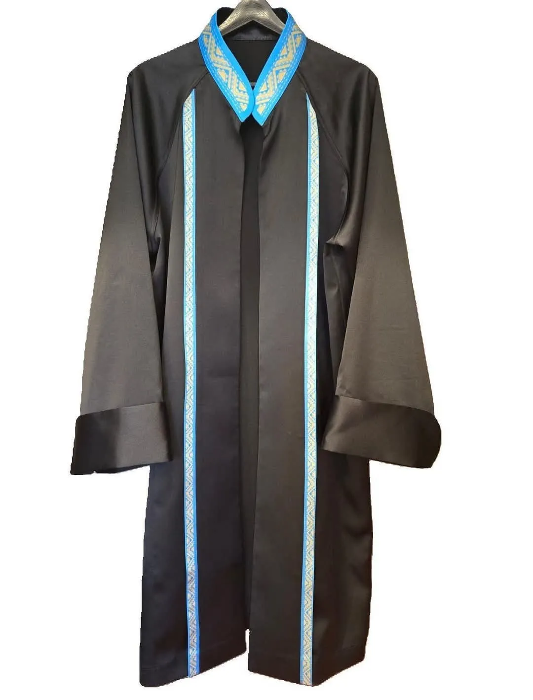 - Черная ткань с воротником-стойкой в небесно-голубом цвете, символизирующем цвет флага Казахстана.