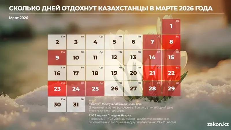 Соответственно, при пятидневной рабочей неделе казахстанцы отдохнут пять дней подряд: 21, 22, 23, 24 и 25 марта (суббота, воскресенье, понедельник, вторник, среда).