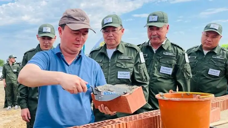 Молодые строители после торжественного собрания сразу приступили к работе. Аким района и сам принял участие в кладке кирпича.